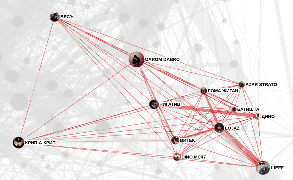 Самая большая клика в графе фитов содержит 12 членов: Батишта, Рома Жиган, Lojaz, Крип-а-Крип, ВесЪ, Azar Strato, Нигатив, Darom Dabro, Dino MC47, ШЕFF, Дино, Витёк